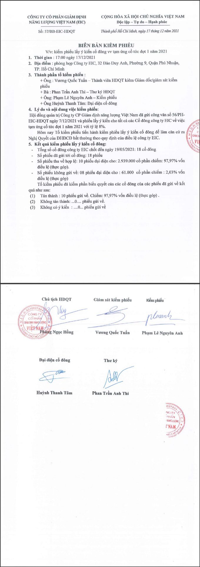 Công ty Cổ phần Giám định Năng lượng Việt Nam xin thông báo về kết quả kiểm phiếu lấy ý kiến cổ đông bằng văn bản về việc tạm ứng cổ tức đợt 1 năm 2021 với tỷ lệ 8%: Tải về